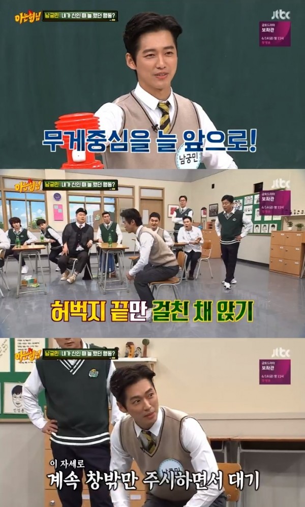정답자는 이수근이었다. 신인시절 늘 무게중심을 앞으로 하고 앉아있었던 것. 남궁민은 “허벅지 끝만 해서 앉아 있었다. 무게 중심을 앞으로 하고 계속 창밖만 주시하고 있었다”라고 설명했다.
