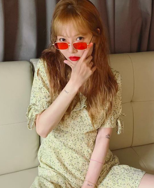 현아는 2일 자신의 인스타그램에 노란색 프릴 원피스에, 빨간색 선글라스를 착용하고 있는 모습이 담긴 여러 장의 사진을 게재했다.