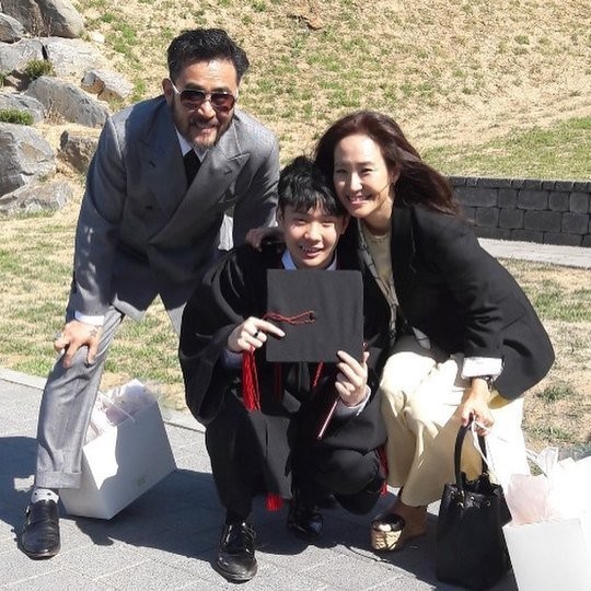 사진 속에는 졸업장을 든 둘째 아들과 옹기종기 모여있는 최민수-강주은 부부의 모습이 담겼다. 최민수-강주은 부부와 둘째 아들은 카메라를 향해 밝게 웃고 있다. 세 사람의 화기애애한 분위기가 시선을 사로잡는다.