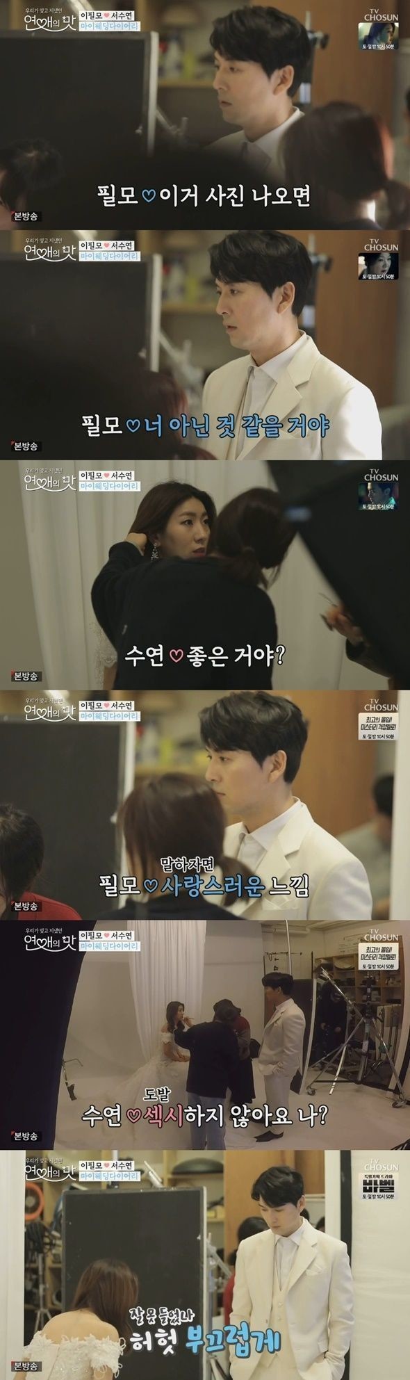 한창 진행하던 중 서수연이 메이크업을 수정을 하기 시작했고 이필모는 서수연에게 다가와 “아주 좋구만~ 이거 사진 나오면 네가 봐도 너 아닌 것 같을 거야”라고 말했다.