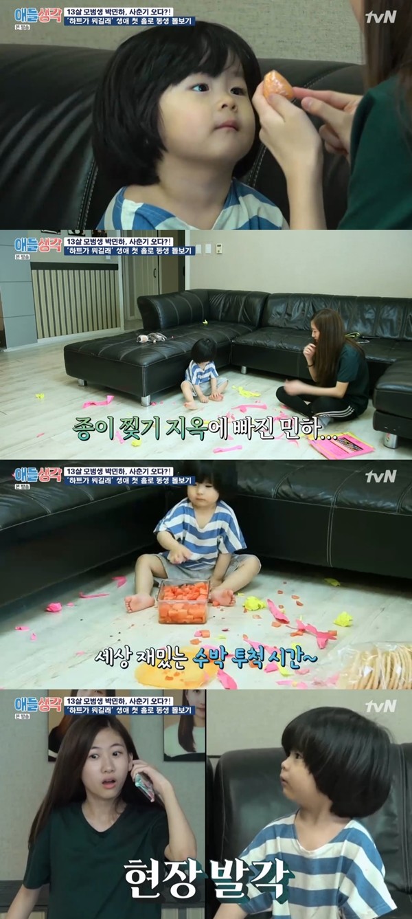 이날 방송에서 박민하는 칭찬 하트를 얻기 위해 3살짜리 동생 민유 군 돌보기를 자처했다.