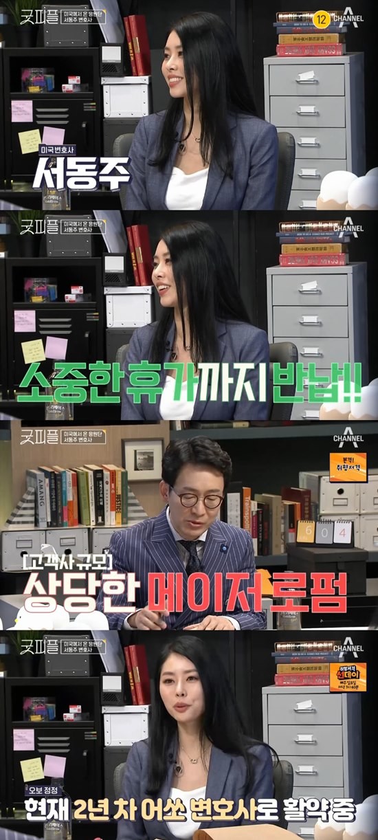 최근 방송된 채널A '신입사원 탄생기-굿피플'에 변호사 서동주가 출연했다. 서동주는 현재 샌프란시스코에서 변호사로 활동 중이며, '굿피플'을 위해 한국에 잠깐 들렀다고 밝혀 좌중을 감탄을 자아냈다.