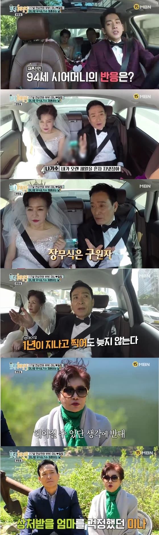 미나의 어머니는 미나가 두 사람의 재혼을 반대했던 이야기도 털어놨다. 장무식은 “만난 지 1년도 안됐을 무렵 웨딩사진을 찍는다고 했더니 미나가 반대했다”라고 말했다. 나기수는 “1년 지나서 찍어도 늦지 않는다고 하는데 솔직히 처음에는 많이 서운했다”라고 밝혔다.