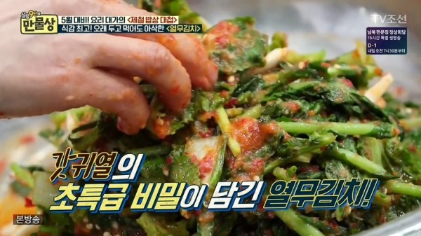 이 날 방송에서 유귀열 조리기능장은 "열무 총각무은 5월이 영양도 많고 제일 맛있다. 찹쌀풀을 쑤지 않은 열무김치다. 풀을 안 쒀도 2~3주는 거뜬하다"고 설명했다.