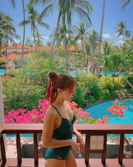 사진에는 초록색 수영복을 입고 있는 국가비의 모습이 담겨있다. 아름다운 모습이 시선을 사로잡는다.
