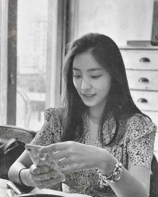 살짝 눈을 내리깐 윤보라는 은은한 미소를 지으며, 청순한 미모를 자랑한다. 윤보라가 착용한 꽃무늬 원피스와 길게 뻗은 손가락도 그의 청순함에 일조한다.