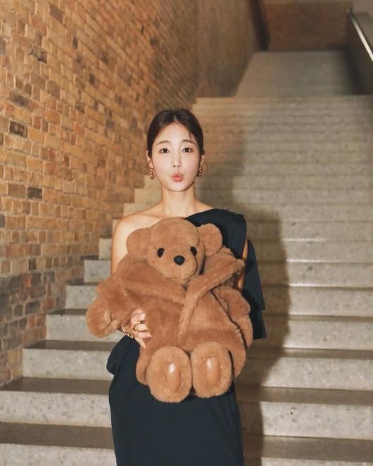 공개된 사진 속 기은세는 곰인형을 안은 채 카메라를 바라보고 있다. 기은세는 블랙 드레스를 입고 우아한 분위기를 내뿜고 있다.