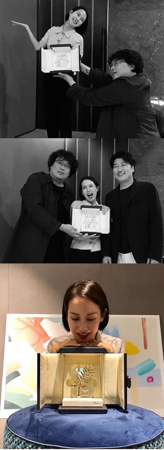 공개된 사진 속 봉준호 감독은 영화 '기생충'으로 받은 황금종려상 트로피를 조여정에게 바치는 포즈를 취하고 있다. 조여정은 그런 봉준호 감독 앞에서 행복한 미소를 감추지 못했다.