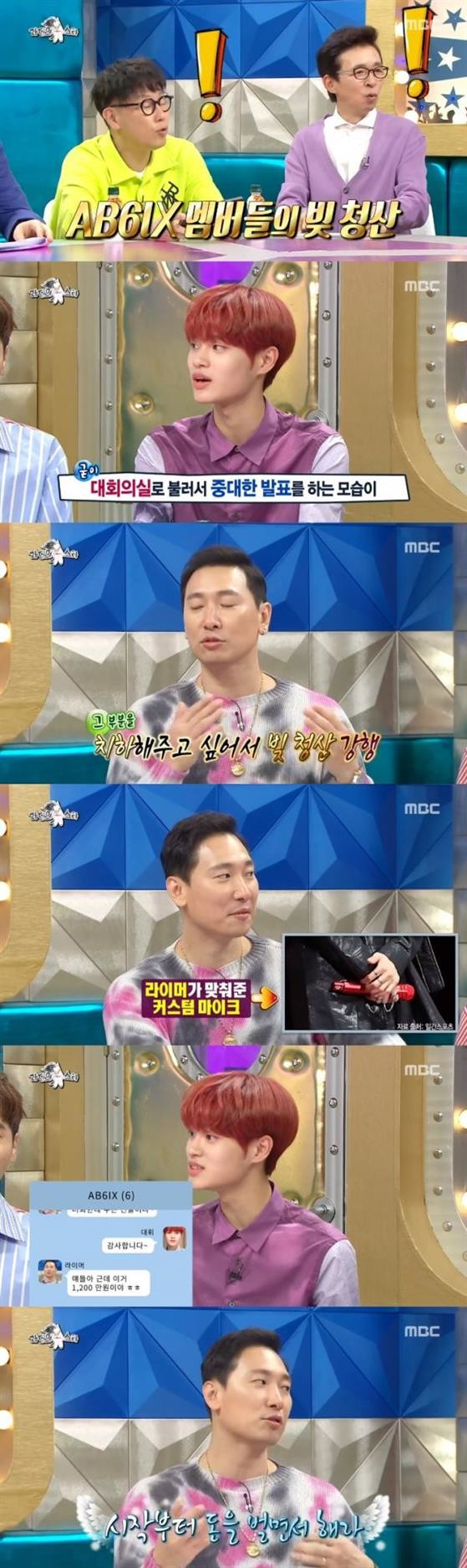 이대휘는 "연습생 생활을 오래 하다 보면 빚이 생기지 않나. 근데 저희 대표님은 AB6IX 멤버들의 빚을 다 청산해줬다"고 밝혔다. 이어 "그 사실을 가볍게 이야기하면 될 것을 대회의실로 불러서 앉혀놓고 중대한 발표를 하시는 모습이 인상 깊었다"고 덧붙여 웃음을 자아냈다.