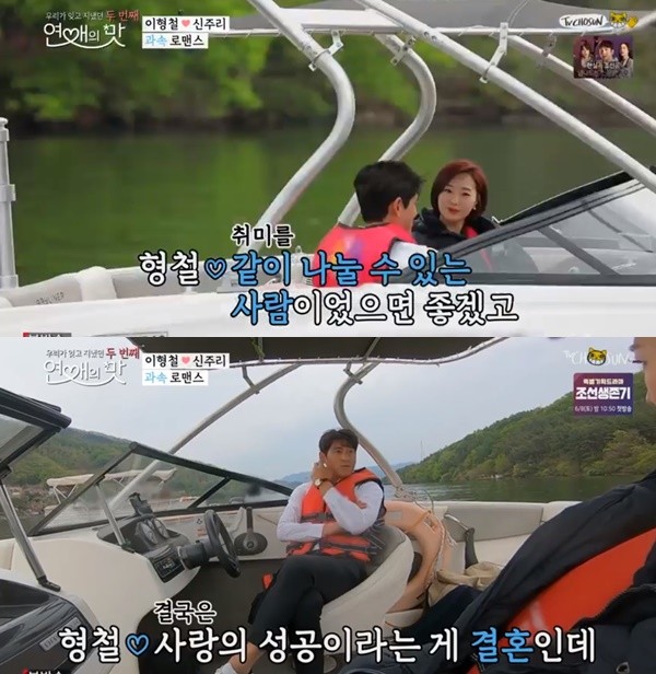이날 이형철은 신주리를 자신의 요트에 태워 수상 데이트에 나섰다. 제작진을 따돌린 두 사람. 이형철은 "난 개인적으로 좋아하는 것들이 색다를 수 있다. 그런 걸 같이 하는 게 중요하다"며 "사랑의 성공은 결혼"이라고 전했다.