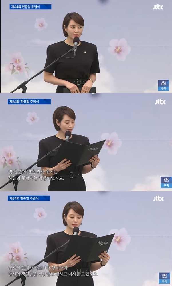 김혜수는 지난 6월 6일 국립서울현충원에서 열린 제64회 현충일 추념식 행사에서 김차희(93) 여사가 쓴 편지 ‘당신을 기다리며 보낸 세월’을 낭독해 눈길을 모았다.