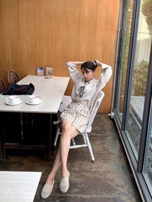 공개된 사진 속 박하선은 의자에 앉아 머리를 뒤로 묶고 있다.