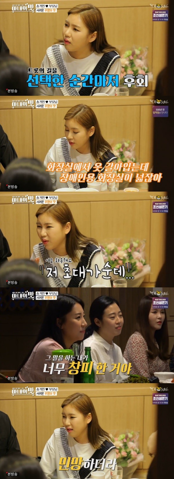 송가인은 무명시절에 고생했던 경험담을 털어놨다. 송가인은 “행사에 갔는데 대기실이 없어서 화장실에서 옷 갈아입었어”라며 “청소하는 아줌마가 하도 안 나오니까 의심을 했나봐”라고 말문을 열었다.