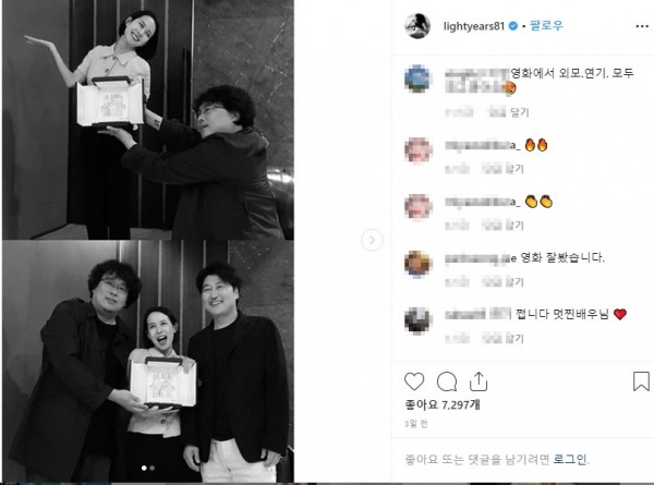 공개된 사진 속에는 조여정에게 트로피를 건네는 봉준호 감독의 모습이 담겨 훈훈함을 자아냈다.