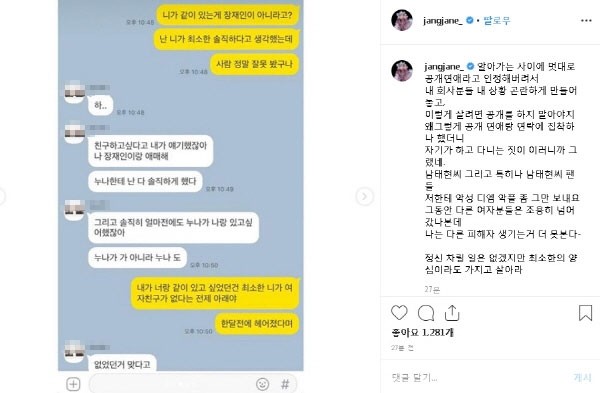 장재인은 메시지 캡처본과 함께 “알아가는 사이에 멋대로 공개연애라고 인정해버려서 내 회사 분들 내 상황 곤란하게 만들어 놓고”라는 글을 적으며 분노했다.