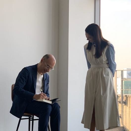 공개된 사진 속에는 신세경과 베르나르 베르베르의 모습이 담겼다. 베르나르 베르베르는 신세경의 책에 사인을 하고 있다. 신세경은 그런 베르나르 베르베르를 보며 활짝 웃는 중이다.