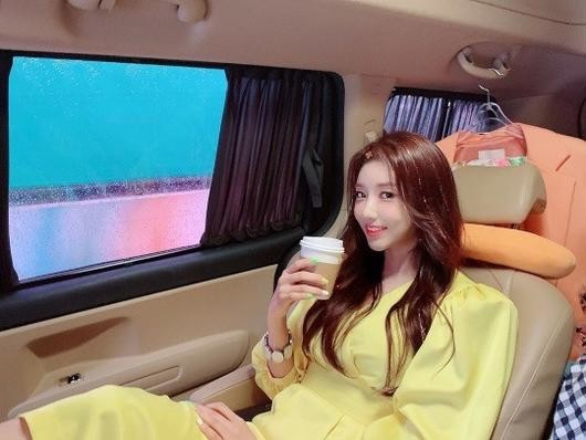 공개된 사진 속 두리는 차 안에서 비 내리는 창 밖을 바라보며 음료를 즐기는 모습. 샛노란 원피스에 반짝이는 헤어 피스가 패션 센스를 드러낸다. 특유의 밝은 기운이 보는 이를 기분 좋게 만든다.