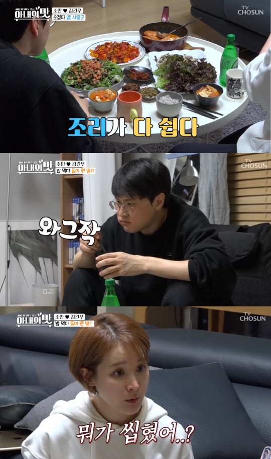 남편 김건우가 식사를 하는 도중, 어디선가 돌 씹는 소리가 들렸다. 조안은 "뭐가 씹였어? 뭘 씹었는데?"하면서 놀란 모습을 보였다. 알고 보니 '와그작' 소리의 정체는 전자레인지에서 해동이 덜 돼 딱딱했던 밥이었다. 조안은 민망해했지만, 남편 김건우는 개의치 않고 조안이 준비한 식사를 맛있게 먹었다.