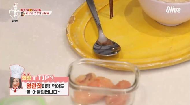 이날 최화정은 "나는 아침에 오트밀을 먹는다"며 "오트밀에 우유를 부어놓고 스케줄 갈 때 가지고 가면 너무 편하고 좋다. 오트밀에 사과도 썰어서 넣고 계피 가루, 소금을 넣으면 더 맛있다. 가끔은 명란젓을 올려 먹기도 한다"고 꿀팁을 공유했다.