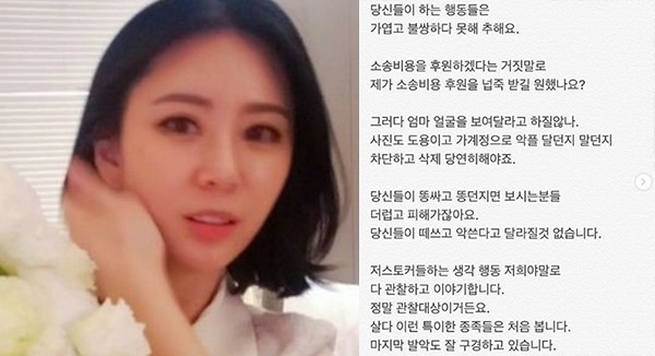 이어 "그러다 엄마 얼굴을 보여달라고 하지를 않나. 사진도 도용이고 가계정으로 악플을 달던지 말던지 차단하고 삭제"라며 "당신들이 X싸고 X던지면 보시는 분들 더럽고 피해가잖아. 떼쓰고 악쓴다고 달라질 것 없다"고 덧붙였다.