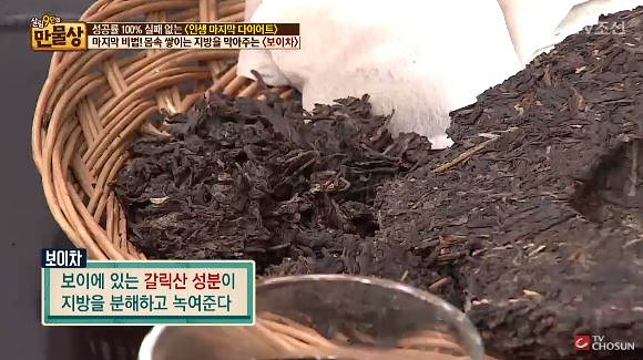 과거 방송된 TV조선 ‘만물상’에서는 성공률 100% 지방 막는 비법음료로 보이차의 효능에 대해 알아보는 시간을 가졌다. 보이차는 보이에 있는 갈릭산 성분이 지방을 분해하고 녹여주는 효과가 있다.