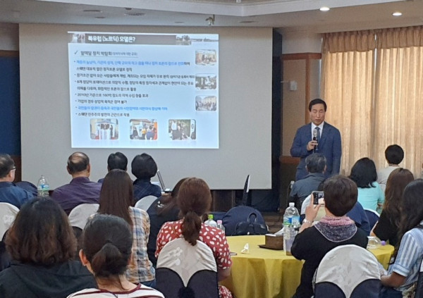 | ▲ 문석진 구청장이 최근 열린 '지역사회보장협의체 연합 워크숍'에서 특강을 진행 하고 있다. (사진제공=서대문구청) | ||