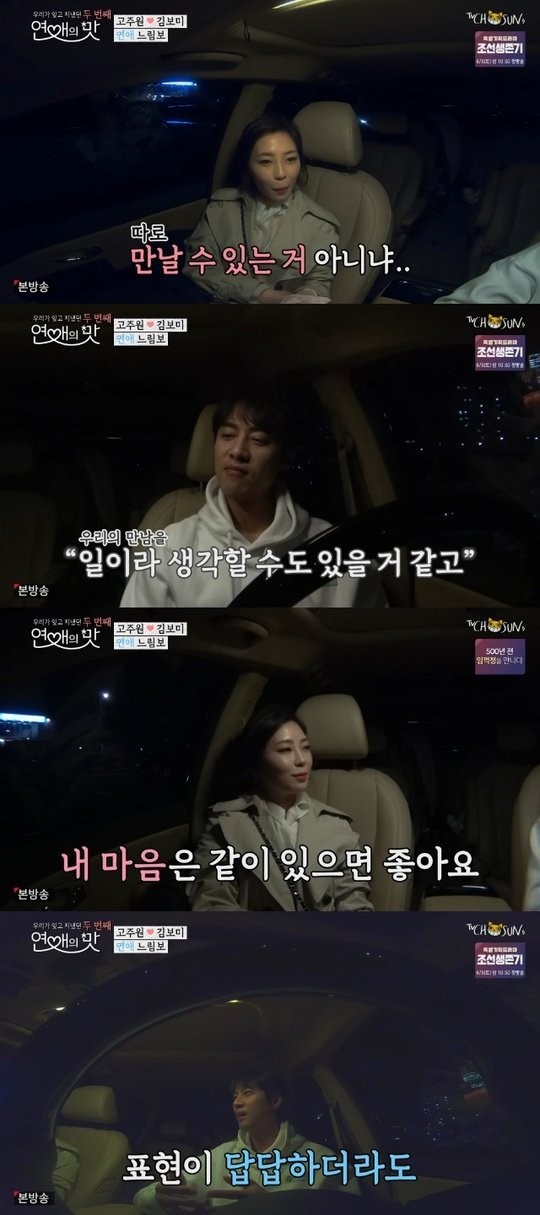 최근 방송된 TV조선 ‘연애의 맛’에서는 40일 만에 깊은 대화를 나누는 고주원 김보미 커플의 모습이 안방을 찾아갔다.