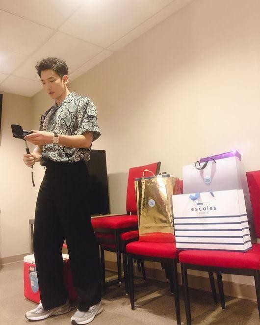 비는 완벽한 셀프 사진을 남기기 위해 여러 각도로 카메라를 움직이는 중. 이때 뱀피 무늬 셔츠와 슬랙스를 착용한 비는 여전히 우월한 피지컬과 훈훈한 비주얼을 자랑한다.