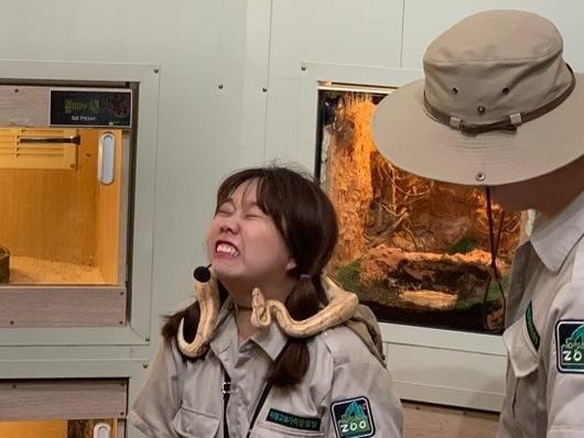 공개된 사진 속 홍현희는 뱀을 목에 감아 깜짝 놀란 모습. 온 얼굴에 힘을 주고 견뎌내는 모습이 보는 이는 폭소하게 만든다. 사파리 복장에 양갈래 머리가 깜찍하게 어울린다.