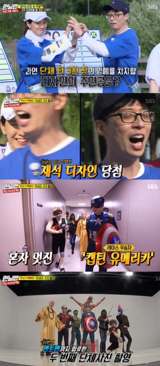 이날 방송에서는 지난주에 이어 ‘런닝맨’ 9주년 특집 프로젝트 ‘런닝맨 팬미팅 - 런닝구 프로젝트’ 부당거래 레이스가 펼쳐졌다. 그 결과 유재석이 ‘팬미팅 굿즈 티셔츠’ 디자이너가 됐다. 멤버들은 유재석의 디자인을 바탕으로 ‘어벤져스’가 되어 파격 분장을 했다.