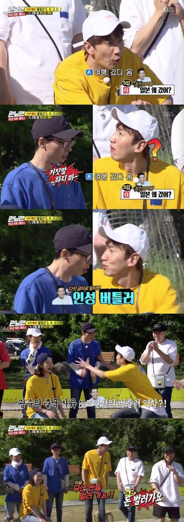 이광수와 전소민 팀의 도전. 제작진은 이광수에게 "조인성과 일본 왜 갔어?"라고 물었다. 앞서 이광수는 배우 조인성, 김우빈 등과 함께 일본으로 여행을 다녀왔던 것.