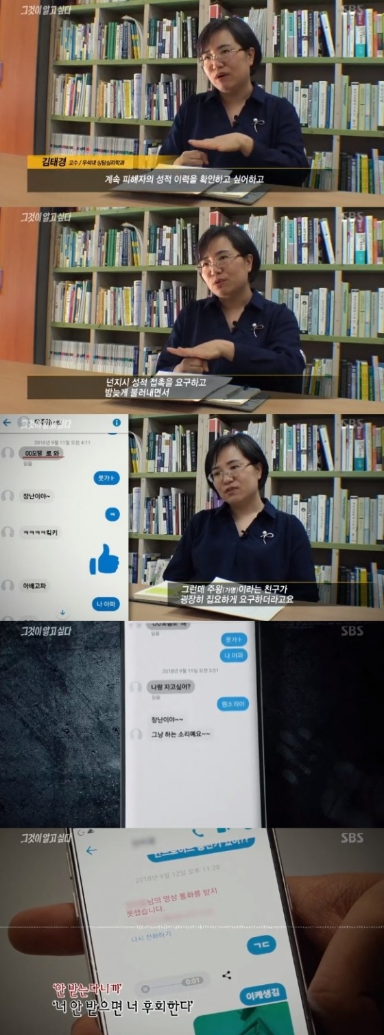 우성대 상담심리학과 김태경 교수는 "피해자가 거부를 또 거절을 해도 계속 반복해서 메세지를 보내거든요", "싫어, 안돼, 집이야 뭐 이렇게 수동적으로 방어하는 그런 양상이었어요"라고 말했다.