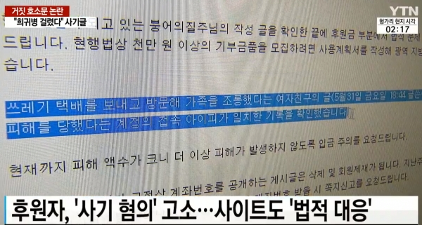 한편, YTN에 따르면 후원자 50여 명은 곽 씨를 사기 혐의로 검찰에 고소했고, 웹 커뮤니티 '보배드림' 측도 법적 대응을 준비하고 있는 것으로 알려졌다.