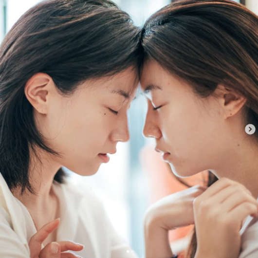 두 장의 사진이 공개된 가운데 두 사람은 메이크업을 전혀 하지 않은 상태로 서로의 얼굴에 기대어 포즈를 취하고 있다.
