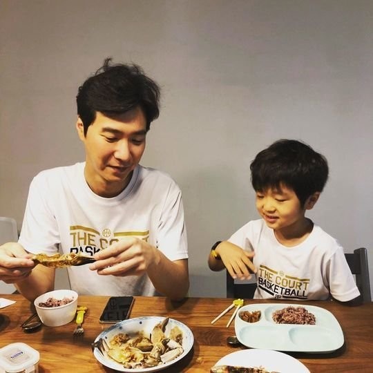 사진 속에는 아들 승재와 밥을 먹는 고지용의 모습이 담겼다. 고지용-승재 부자는 똑같은 티셔츠를 입고 있다. 두 부자의 닮은꼴 외모가 눈길을 끈다.