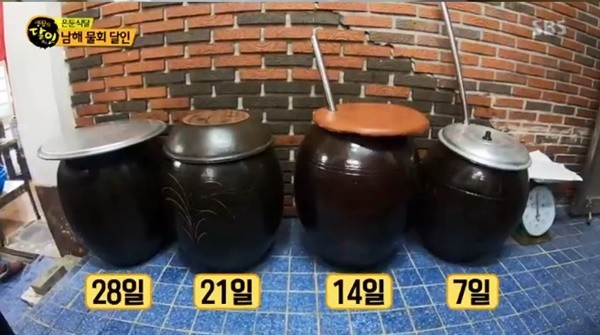 남해물회달인은 숙성기간 일주일 간격으로 구분한 4개의 항아리들을 보여주며 “일주일 간격으숙성시간이 지날수록 다른 빛깔을 내며 완성되어 가는 맛을 잠행단은 혀 끝으로 느꼈다.