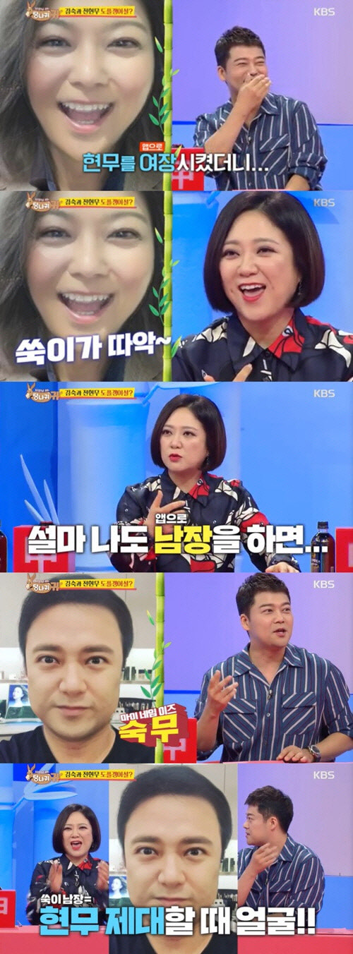 남장한 김숙의 사진을 본 전현무는 "제가 군대 제대했을 때 저 표정으로 찍은 사진이 있다"고 말해 폭소를 자아냈다.