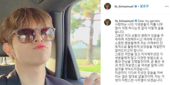 김사무엘은 지난 6월 8일 자신의 SNS에 “사랑하는 나의 가넷(김사무엘 팬클럽) 분들이 저를 너무 많이 걱정 하시는 것 같아 이렇게 글을 쓴다”면서 “소중한 팬 분들에게 저는 이제부터 단독적으로 활동하게 됐음을 제일 먼저 알려드리고자 한다”고 밝혔다.