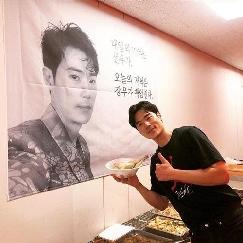 공개된 사진 속 김강우는 '내일의 기억은 선우가, 오늘의 저녁은 강우가 책임진다'는 플래카드 아래서 삼계탕을 들고 엄지를 들어 보이고 있다. 훈훈한 미소가 눈길을 사로잡는다.