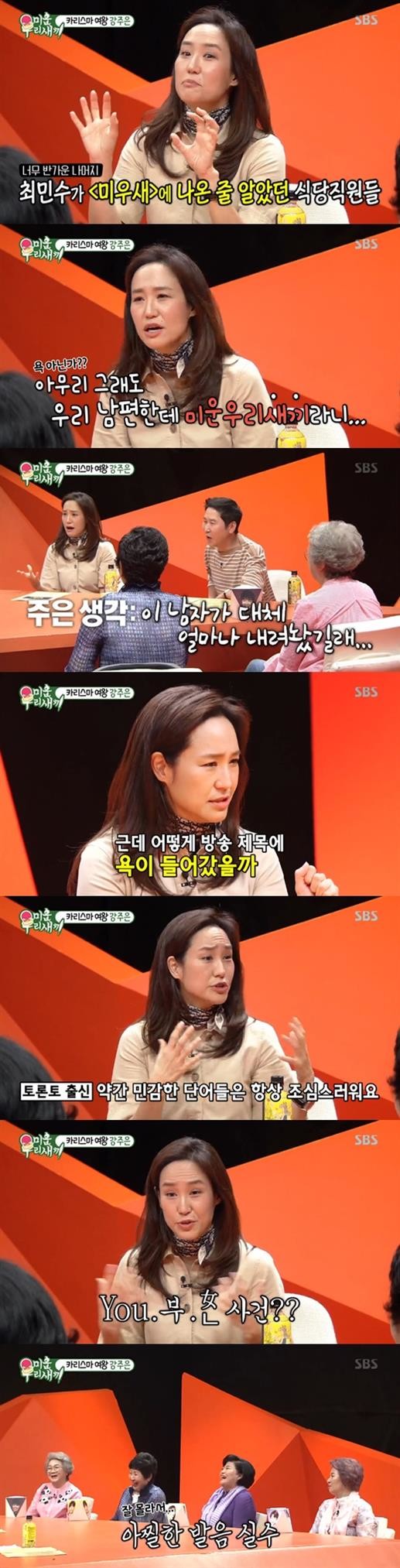 이날 강주은은 "예전에는 내가 '미운 우리 새끼'라는 이 방송의 제목을 몰랐다. 어느 날 식당에 들어갔는데 아주머니들이 남편 최민수를 너무 반가워하면서 '미운 우리 새끼'라고 했다"며 말문을 열었다.