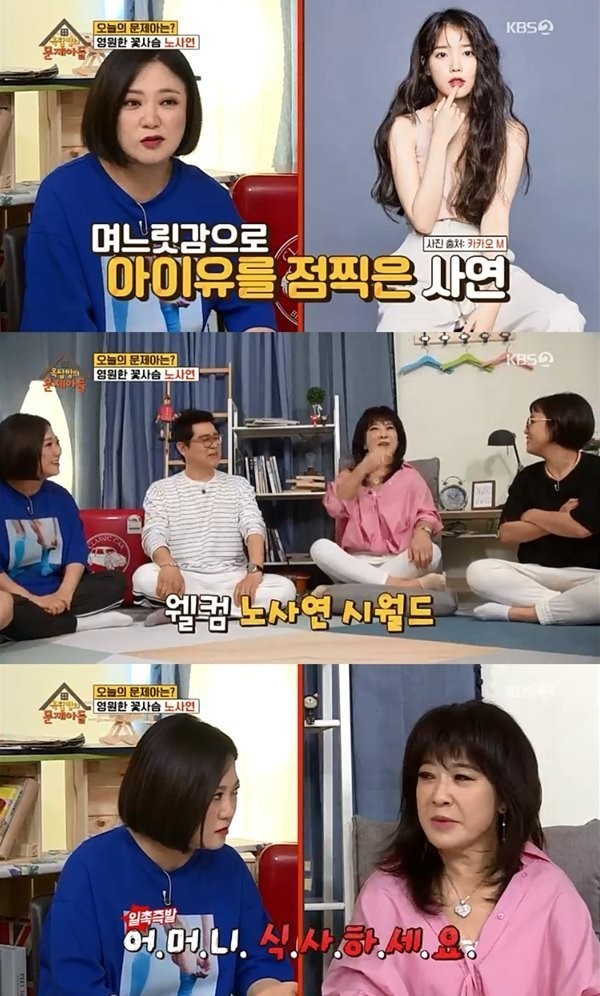 노사연은 '아이유를 며느리 삼고 싶다고 했더라'는 말에 "어제 했던 말도 기억이 안 난다"면서 "아이유는 사랑하는 동생이다. '영웅호걸' 이후 지금까지 이어왔다. 잊지 않고 선물을 보내준다. 로열젤리나 석청 등 건강식품을 준다"고 아이유의 인성을 자랑했다.