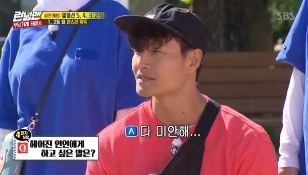 2인 1조로 제작진의 질문에 5글자, 4글자, 3글자, 2글자, 1글자로 글자 수를 줄여가며 답해야 하는 퀴즈에서 김종국은 “헤어진 연인에게 하고 싶은 말은?”이라는 질문에 4글자로 답해야 하는 상황이 됐다.