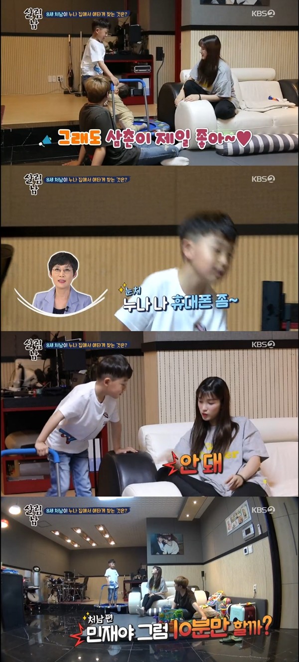 이 모습을 본 율희는 화를 참지 않았다. 그는 "10분만 하라고 하지 않았냐. 집에서도 이렇게 게임을 많이 하냐"며 "안되겠다. 누나랑 공부 하자"고 말하며 민재 군에게 문제집을 들이밀었다.