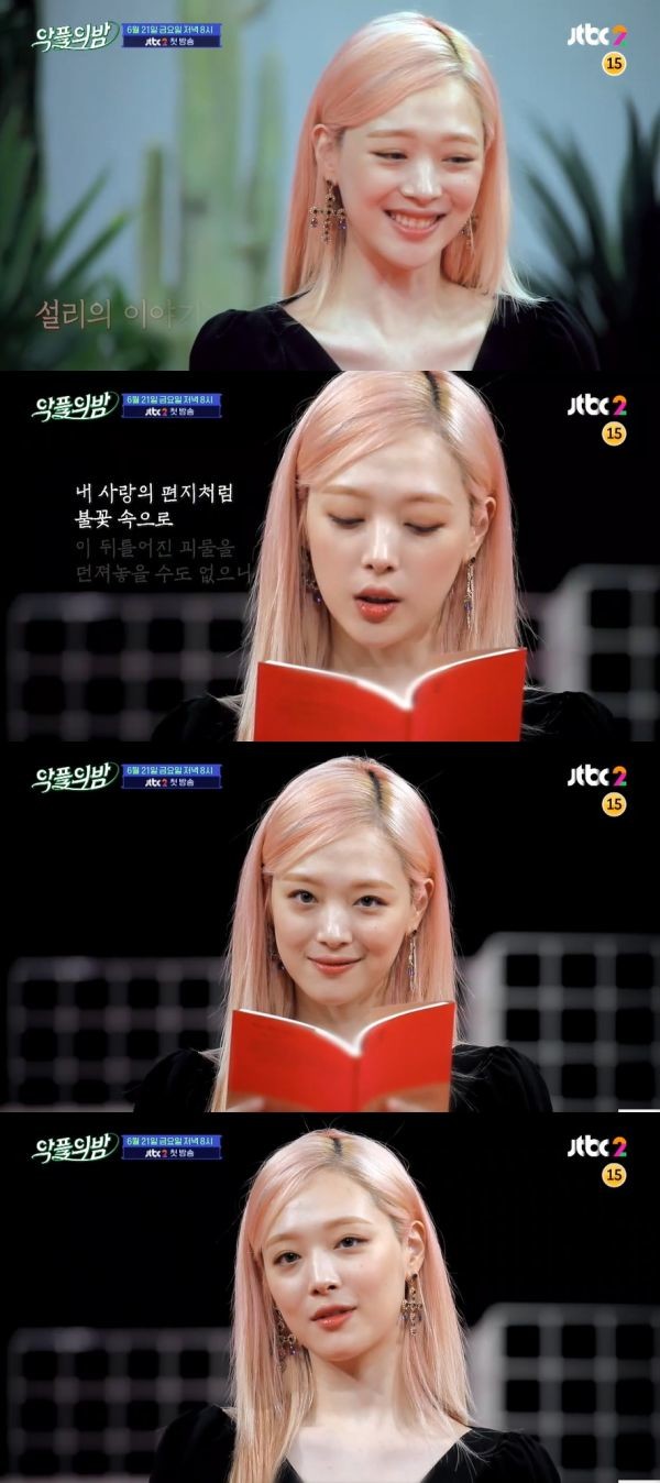 그중 설리는 프랑스 시인 샤를 보들레르의 시집 '악의 꽃'에 실린 '축복의 말' 일부를 읽으며 등장했다.