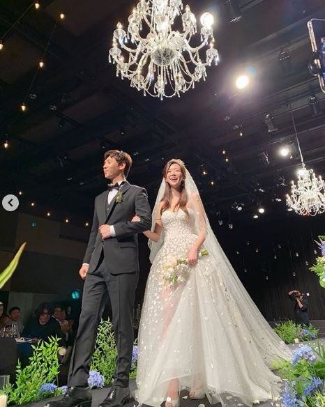 이날 두 사람의 아름다운 결혼식 본식 장면이 함께 공개됐다. 에이스는 블랙 턱시도를 멋지게 차려입고 늠름한 자태를 자랑했다. 긴 머리를 늘어뜨린 김지혜는 여신 미모를 뽐내며 환한 미소로 하객들에게 화답했다.