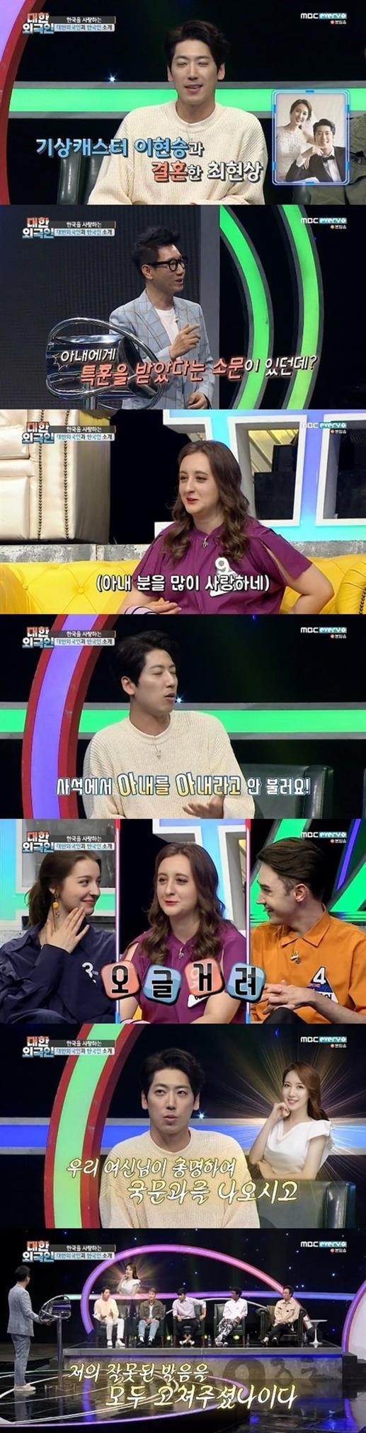 앞서 '이상한 나라의 며느리'를 통해 아내인 MBC 기상캐스터 이현승과의 결혼 생활을 공개해온 최현상은 이날 이현승으로부터 '대한외국인' 출연 전 특훈을 받았다는 사실을 전하며 "아내 되시는 분께서"라고 표현해 시선을 사로잡았다.