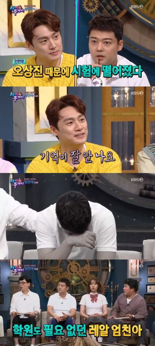 이말을 듣고 있던 전현무는 "가만히 들어보니 묘하게 기분이 나쁘다. 묘하게 비슷한 데 조금씩 처진다"며 "저는 전국 50등 정도 해본 적은 있다. 공부도 밤새하는 스타일이다. 그리고 저는 엄마가 때려서 공부했다"고 말해 웃음을 안겼다.