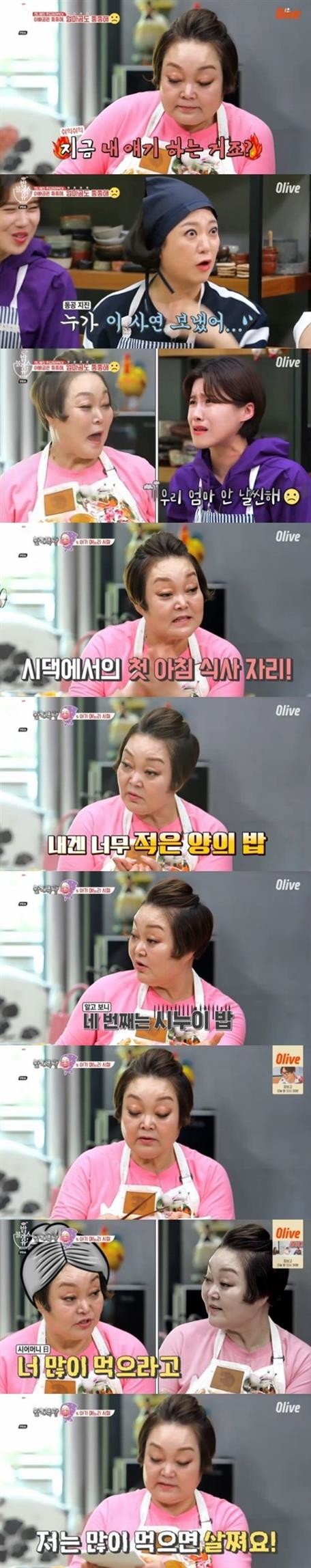 또 이혜정은 "처음 시댁 가서 아침을 처음 차렸다. 첫 번째는 시아버지, 두 번째는 시어머니, 세 번째는 남편이었다. 네 번째는 내 것일 줄 알았다. 밥이 너무 적어서 봤는데, 시누이 것이었다. 나는 맨 마지막이었다. 심지어 주걱에 붙은 밥이었다"라고 말해 멤버들을 분노하게 했다.