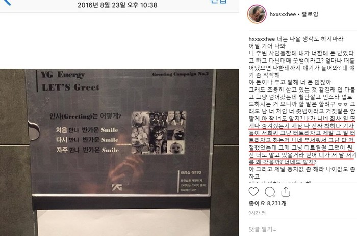 한서희는 저격글에서 'YG Energy LET'S Greet'라고 적힌 화장실 에티켓 포스터 사진을 함께 올렸다.