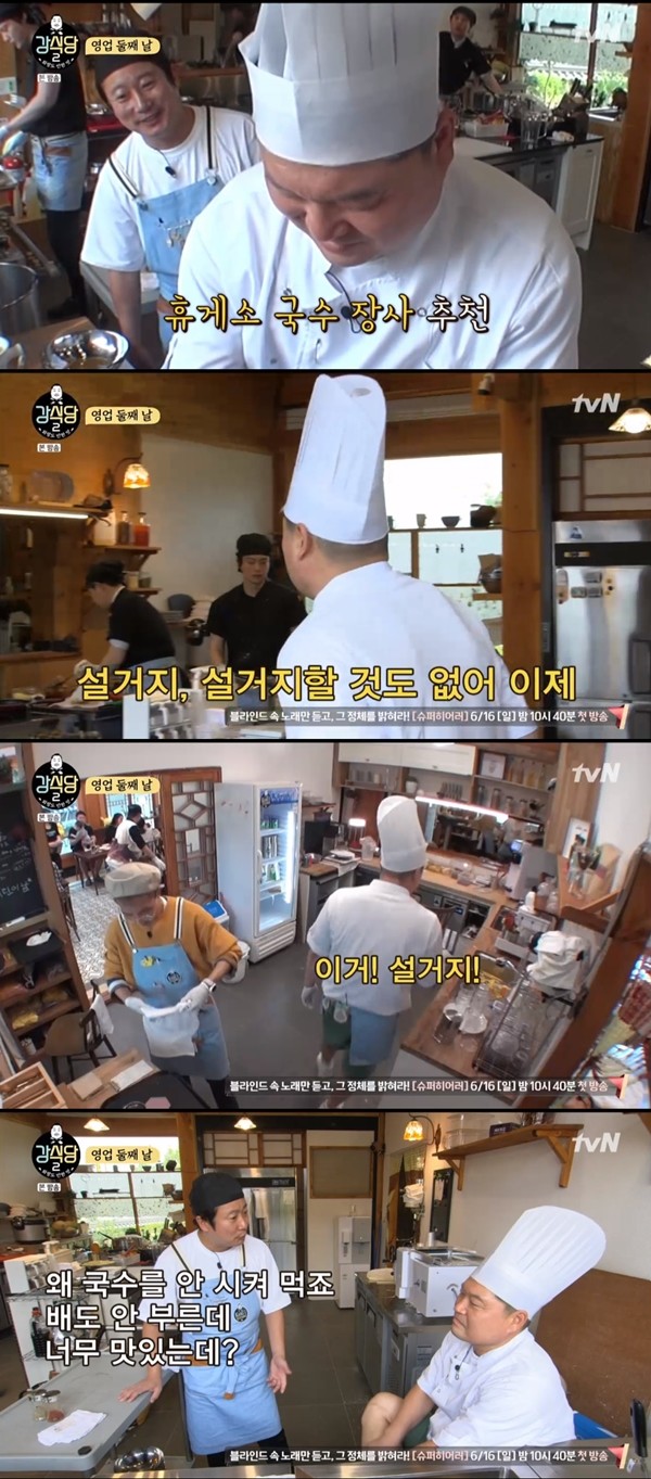 이에 강호동은 "바쁘지 않은데 고단하다. 국수가 잘 안 팔려 설거지만 하고 있다"며 "그런데 이제 설거지 거리도 없다"고 속상한 마음을 토로했다.